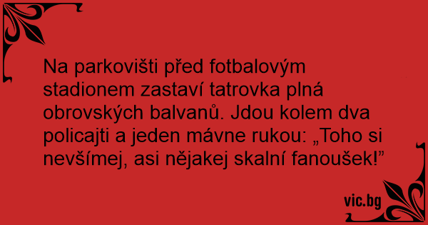 Na parkovišti před fotbalovým stadionem zastaví tatrovka plná obrovských balvanů. Jdou kolem dva policajti a jeden mávne rukou: „Toho si nevšímej, asi nějakej skalní fanoušek!”