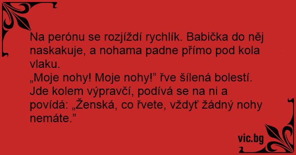 Jde kolem výpravčí, podívá se na ni a povídá: „Ženská, co řvete, vždyť žádný nohy nemáte.”