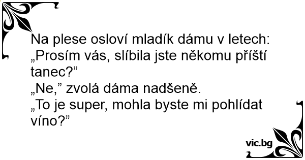 Na plese osloví mladík dámu v letech: „Prosím vás, slíbila jste někomu příští tanec?”