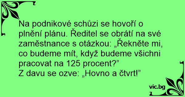 Na podnikové schůzi se hovoří o plnění plánu. Ředitel se obrátí na své zaměstnance s otázkou: „Řekněte mi, co budeme mít, když budeme všichni pracovat na 125 procent?”