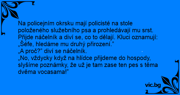 Na policejním okrsku mají policisté na stole položeného služebního psa a prohledávají mu srst. Přijde náčelník a diví se, co to dělají. Kluci oznamují: „Šéfe, hledáme mu druhý přirození.”
