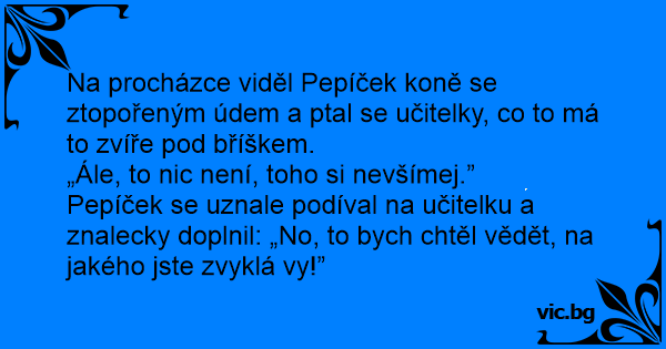 Pepíček se uznale podíval na učitelku a znalecky doplnil: „No, to bych chtěl vědět, na jakého jste zvyklá vy!”