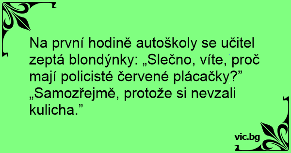Na první hodině autoškoly se učitel zeptá blondýnky: „Slečno, víte, proč mají policisté červené plácačky?”