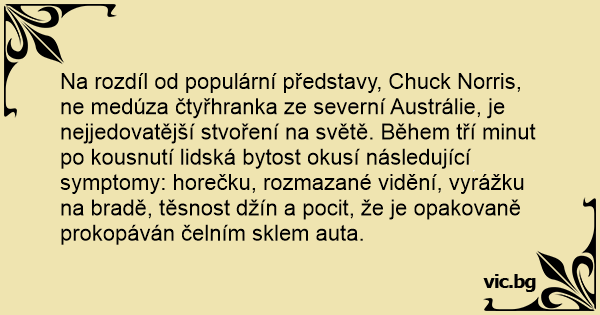 Na rozdíl od populární představy, Chuck Norris, ne medúza čtyřhranka ze severní Austrálie, je nejjedovatější stvoření na světě. Během tří minut po kousnutí lidská bytost okusí následující symptomy: horečku, rozmazané vidění, vyrážku na bradě, těsnost džín a pocit, že je opakovaně prokopáván čelním sklem auta.