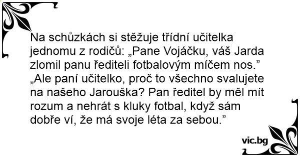 Na schůzkách si stěžuje třídní učitelka jednomu z rodičů: „Pane Vojáčku, váš Jarda zlomil panu řediteli fotbalovým míčem nos.”