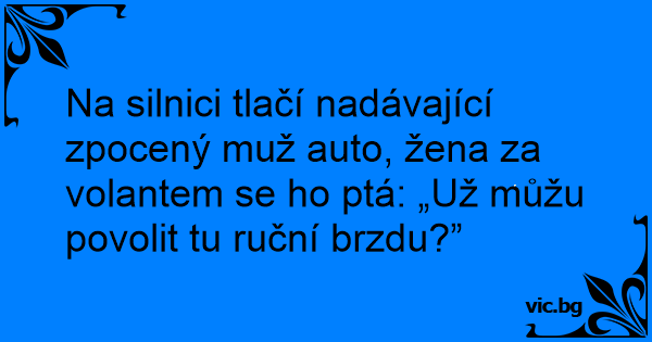 Na silnici tlačí nadávající zpocený muž auto, žena za volantem se hо ptá: „Už můžu povolit tu ruční brzdu?”