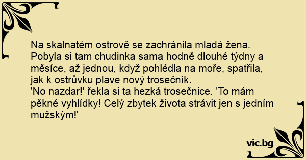 Na skalnatém ostrově se zachránila mladá žena. Pobyla si tam chudinka sama hodně dlouhé týdny a měsíce, až jednou, když pohlédla na moře, spatřila, jak k ostrůvku plave nový trosečník.