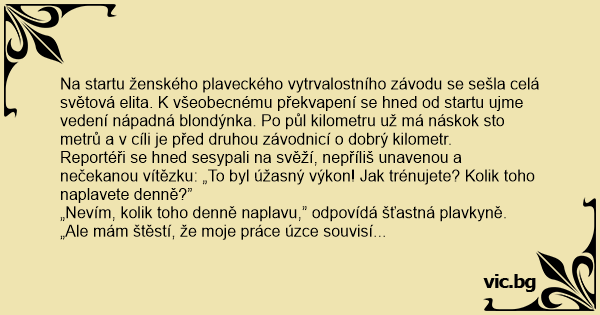 Na startu ženského plaveckého vytrvalostního závodu se sešla celá světová elita. K všeobecnému překvapení se hned od startu ujme vedení nápadná blondýnka. Po půl kilometru už má náskok sto metrů a v cíli je před druhou závodnicí o dobrý kilometr.