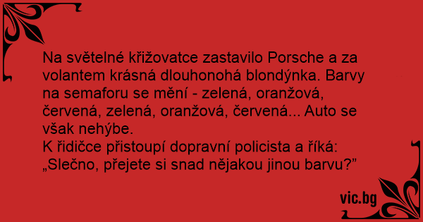 Na světelné křižovatce zastavilo Porsche a za volantem krásná dlouhonohá blondýnka. Barvy na semaforu se mění - zelená, oranžová, červená, zelená, oranžová, červená... Auto se však nehýbe.