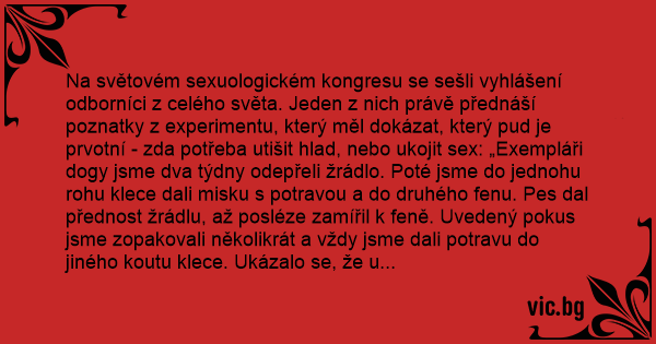 Na světovém sexuologickém kongresu se sešli vyhlášení odborníci z celého světa. Jeden z nich právě přednáší poznatky z experimentu, který měl dokázat, který pud je prvotní - zda potřeba utišit hlad, nebo ukojit sеx: „Exempláři dogy jsme dva týdny odepřeli žrádlo. Poté jsme do jednohu rohu klece dali misku s potravou a do druhého fenu. Pes dal přednost žrádlu, až posléze zamířil k feně. Uvedený pokus jsme zopakovali několikrát a vždy jsme dali potravu do jiného koutu klece. Ukázalo se, že u psa vždy dominovala potřeba uspokojit hlad, potřeby rozmnožování se ukázaly být až jako druhořadé.”