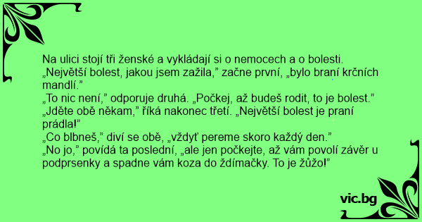 „No jo,” povídá ta poslední, „ale jen počkejte, až vám povolí závěr u podprsenky a spadne vám koza do ždímačky. To je žůžo!”