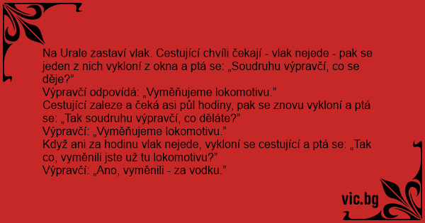 Na Urale zastaví vlak. Cestující chvíli čekají - vlak nejede - pak se jeden z nich vykloní z okna a ptá se: „Soudruhu výpravčí, co se děje?”