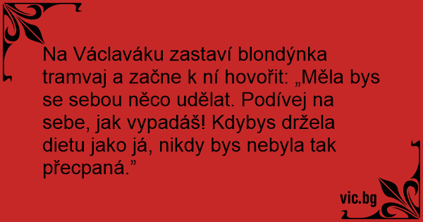 Na Václaváku zastaví blondýnka tramvaj a začne k ní hovořit: „Měla bys se sebou něco udělat. Podívej na sebe, jak vypadáš! Kdybys držela dietu jako já, nikdy bys nebyla tak přecpaná.”