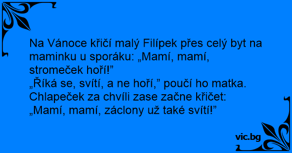 Na Vánoce křičí malý Filípek přes celý byt na maminku u sporáku: „Mamí, mamí, stromeček hoří!”
