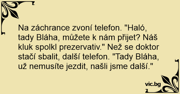 Na záchrance zvoní telefon. "Haló, tady Bláha, můžete k nám přijet? Náš kluk spolkl prezervativ." Než se doktor stačí sbalit, další telefon. "Tady Bláha, už nemusíte jezdit, našli jsme další."