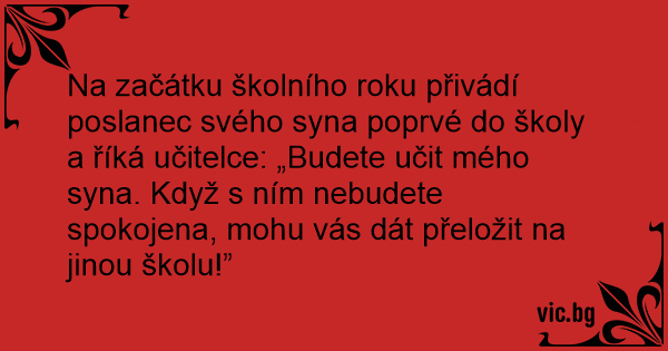 Na začátku školního roku přivádí poslanec svého syna poprvé do školy a říká učitelce: „Budete učit mého syna. Když s ním nebudete spokojena, mohu vás dát přeložit na jinou školu!”