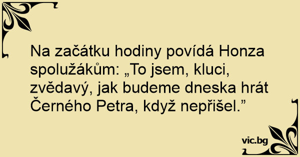 Na začátku hodiny povídá Honza spolužákům: „To jsem, kluci, zvědavý, jak budeme dneska hrát Černého Petra, když nepřišel.”