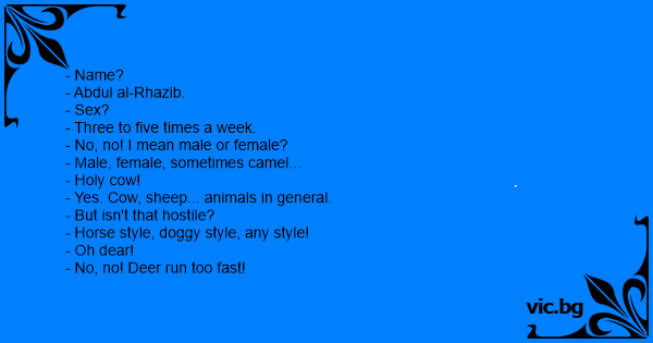 An arab at the airport: - Name? - Abdul al-Rhazib. - Sex? - Three to five times a week. - No, no... I mean male or female? - Male, female, sometimes camel. - Holy cow! - Cow, sheep, animals in...