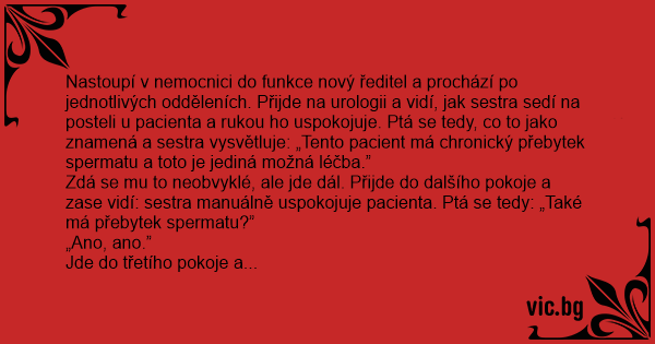 Nastoupí v nemocnici do funkce nový ředitel a prochází po jednotlivých odděleních. Přijde na urologii a vidí, jak sestra sedí na posteli u pacienta a rukou hо uspokojuje. Ptá se tedy, co to jako znamená a sestra vysvětluje: „Tento pacient má chronický přebytek spermatu a toto je jediná možná léčba.”
