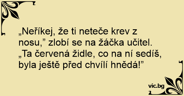 „Neříkej, že ti neteče krev z nosu,” zlobí se na žáčka učitel. „Ta červená židle, co na ní sedíš, byla ještě před chvílí hnědá!”