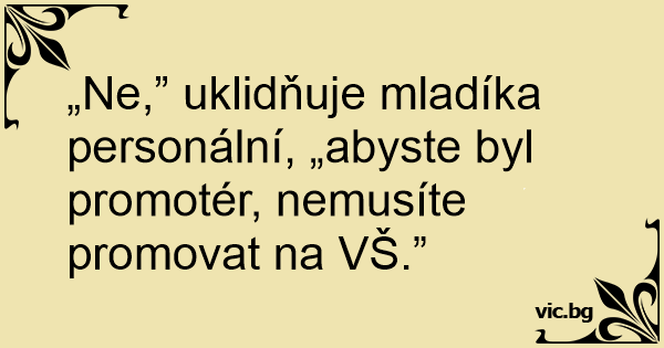 „Ne,” uklidňuje mladíka personální, „abyste byl promotér, nemusíte promovat na VŠ.”