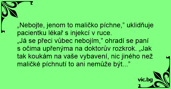 „Já se přeci vůbec nebojím,” ohradí se paní s očima upřenýma na doktorův rozkrok. „Jak tak koukám na vaše vybavení, nic jiného než maličké píchnutí to ani nemůže být...”