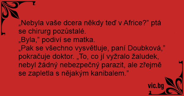 „Pak se všechno vysvětluje, paní Doubková,” pokračuje doktor. „To, co jí vyžralo žaludek, nebyl žádný nebezpečný parazit, ale zřejmě se zapletla s nějakým kanibalem.”