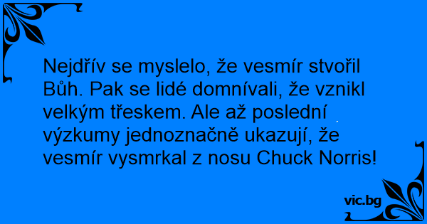 Nejdřív se myslelo, že vesmír stvořil Bůh. Pak se lidé domnívali, že vznikl velkým třeskem. Ale až poslední výzkumy jednoznačně ukazují, že vesmír vysmrkal z nosu Chuck Norris!
