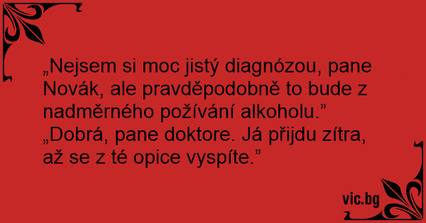 „Nejsem si moc jistý diagnózou, pane Novák, ale pravděpodobně to bude z nadměrného požívání alkoholu.”