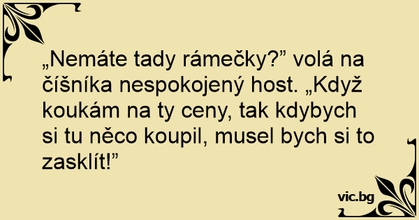 „Nemáte tady rámečky?” volá na číšníka nespokojený host. „Když koukám na ty ceny, tak kdybych si tu něco koupil, musel bych si to zasklít!”