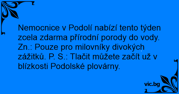 Nemocnice v Podolí nabízí tento týden zcela zdarma přírodní porody do vody. Zn.: Pouze pro milovníky divokých zážitků. P. S.: Tlačit můžete začít už v blízkosti Podolské plovárny.