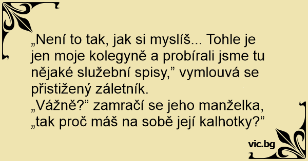 „Vážně?” zamračí se jeho manželka, „tak proč máš na sobě její kalhotky?”