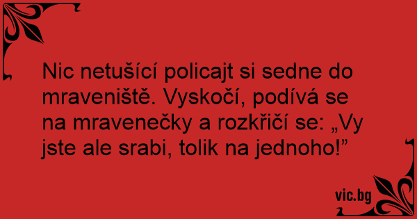 Nic netušící policajt si sedne do mraveniště. Vyskočí, podívá se na mravenečky a rozkřičí se: „Vy jste ale srabi, tolik na jednoho!”