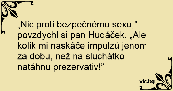 „Nic proti bezpečnému sexu,” povzdychl si pan Hudáček. „Ale kolik mi naskáče impulzů jenom za dobu, než na sluchátko natáhnu prezervativ!”