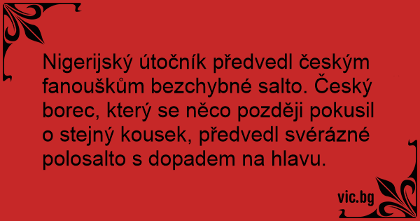 Nigerijský útočník předvedl českým fanouškům bezchybné salto. Český borec, který se něco později pokusil o stejný kousek, předvedl svérázné polosalto s dopadem na hlavu.