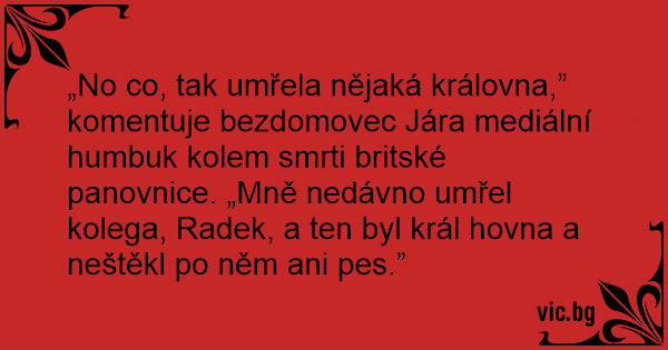 „No co, tak umřela nějaká královna,” komentuje bezdomovec Jára mediální humbuk kolem smrti britské panovnice. „Mně nedávno umřel kolega, Radek, a ten byl král hovna a neštěkl po něm ani pes.”