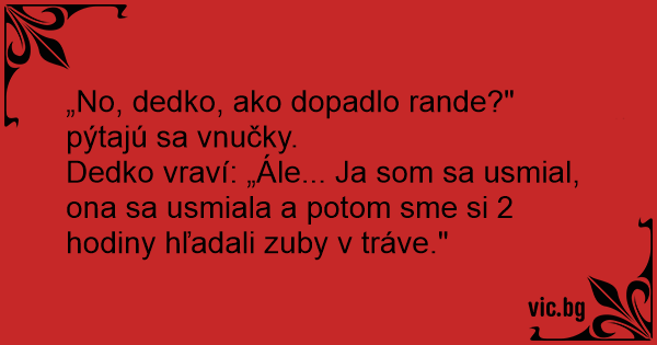 Dedko vraví: „Ále... Ja som sa usmial, ona sa usmiala a potom sme si 2 hodiny hľadali zuby v tráve."