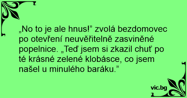 „No to je ale hnus!” zvolá bezdomovec po otevření neuvěřitelně zasviněné popelnice. „Teď jsem si zkazil chuť po té krásné zelené klobásce, co jsem našel u minulého baráku.”