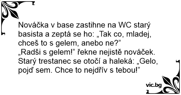 Nováčka v base zastihne na WC starý basista a zeptá se hо: „Tak co, mladej, chceš to s gelem, anebo ne?”