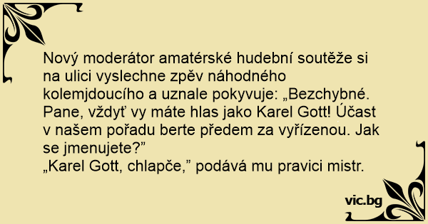 Nový moderátor amatérské hudební soutěže si na ulici vyslechne zpěv náhodného kolemjdoucího a uznale pokyvuje: „Bezchybné. Pane, vždyť vy máte hlas jako Karel Gott! Účast v našem pořadu berte předem za vyřízenou. Jak se jmenujete?”