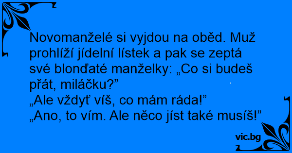 Novomanželé si vyjdou na oběd. Muž prohlíží jídelní lístek a pak se zeptá své blonďaté manželky: „Co si budeš přát, miláčku?”