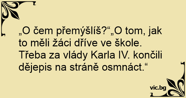 „O čem přemýšlíš?“„O tom, jak to měli žáci dříve ve škole. Třeba za vlády Karla IV. končili dějepis na stráně osmnáct.“