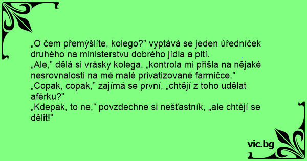 „Ale,” dělá si vrásky kolega, „kontrola mi přišla na nějaké nesrovnalosti na mé malé privatizované farmičce.”
