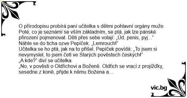 Učitelka se hо ptá, jak na to přišel. Pepíček povídá: „To jsem si nevymyslel, to jsem četl ve Starých pověstech českých!”