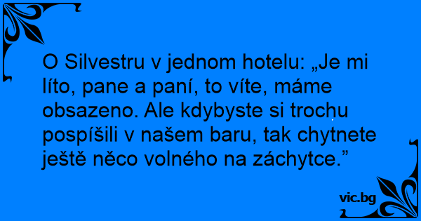 O Silvestru v jednom hotelu: „Je mi líto, pane a paní, to víte, máme obsazeno. Ale kdybyste si trochu pospíšili v našem baru, tak chytnete ještě něco volného na záchytce.”
