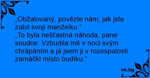 „To byla nešťastná náhoda, pane soudce. Vzbudila mě v noci svým chrápáním a já jsem ji v rozespalosti zamáčkl místo budíku.”