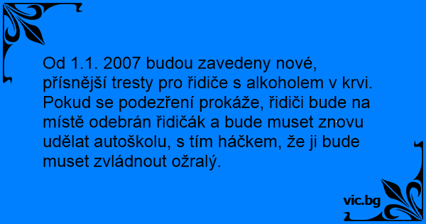 Od 1.1. 2007 budou zavedeny nové, přísnější tresty pro řidiče s alkoholem v krvi. Pokud se podezření prokáže, řidiči bude na místě odebrán řidičák a bude muset znovu udělat autoškolu, s tím háčkem, že ji bude muset zvládnout ožralý.