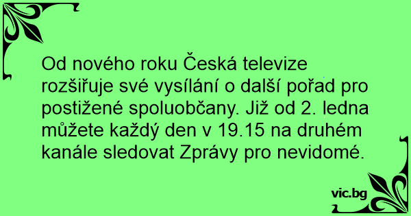 Od nového roku Česká televize rozšiřuje své vysílání o další pořad pro postižené spoluobčany. Již od 2. ledna můžete každý den v 19.15 na druhém kanále sledovat Zprávy pro nevidomé.