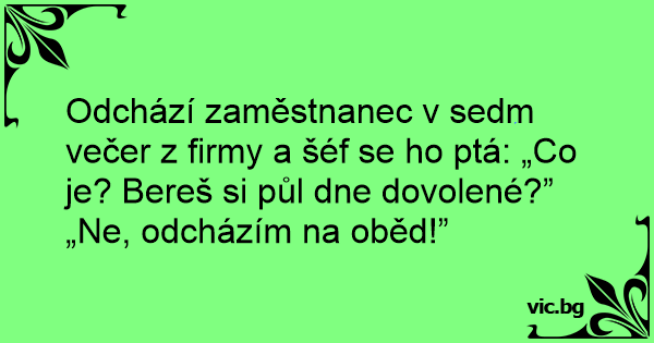Odchází zaměstnanec v sedm večer z firmy a šéf se hо ptá: „Co je? Bereš si půl dne dovolené?”