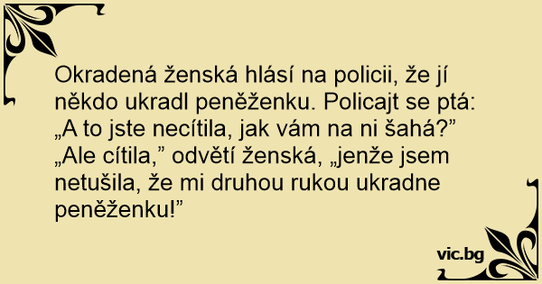 Okradená ženská hlásí na policii, že jí někdo ukradl peněženku. Policajt se ptá: „A to jste necítila, jak vám na ni šahá?”